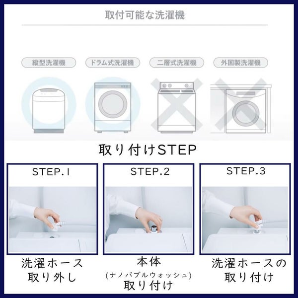 お使いの洗濯機につけるだけでナノバブルが発生し、洗浄力がアップする洗濯アダプター。