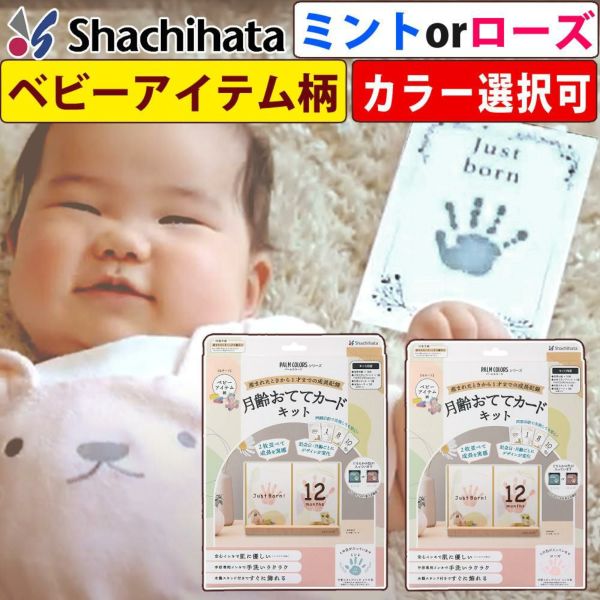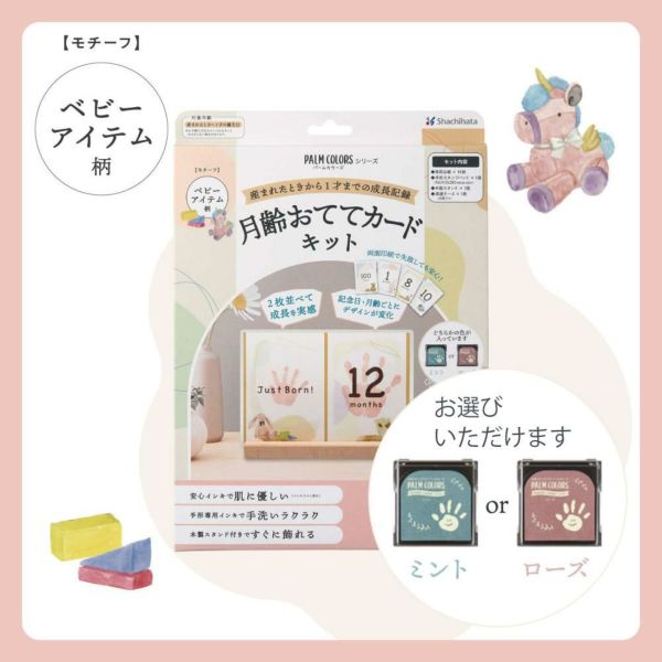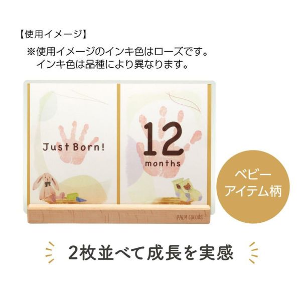 ▼PALM COLORS シリーズ 月齢おててカードキット ベビーアイテム柄 ミント または ローズ(インクカラー選択可)