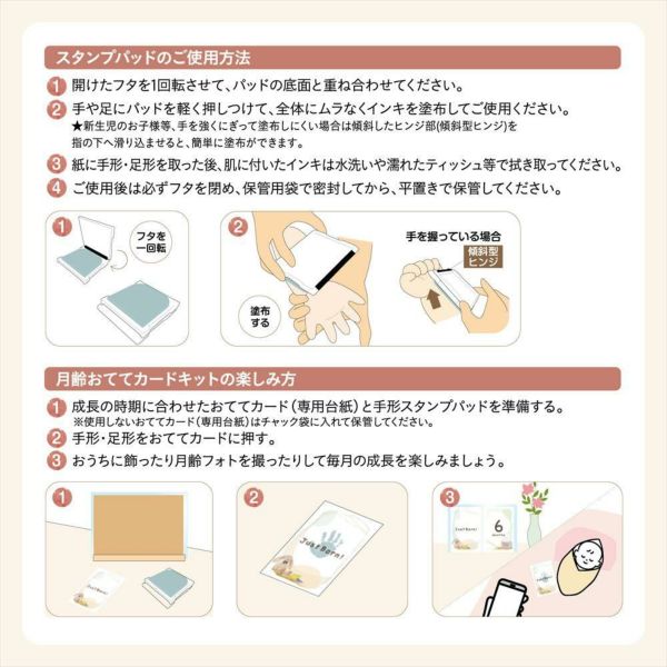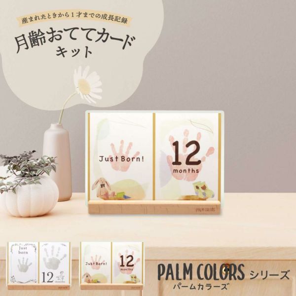 産まれた瞬間から1才のお誕生日までの成長を、毎月の 手形アート や 写真映え する 月齢フォト として記録できる「 月齢おててカードキット 」。 赤ちゃんの成長記録 を おしゃれ育児グッズ として残せるこのキットは、 出産祝い や ベビーギフト にも最適。 専用の ハガキサイズ台紙 と 手形スタンプキット がセットになっていて、 簡単手形スタンプ を家族みんなで楽しめます。 木製スタンド付き で、記念の 手形記録キット を飾って思い出に。 安全な 水性顔料インキ 使用で 赤ちゃん にも安心。