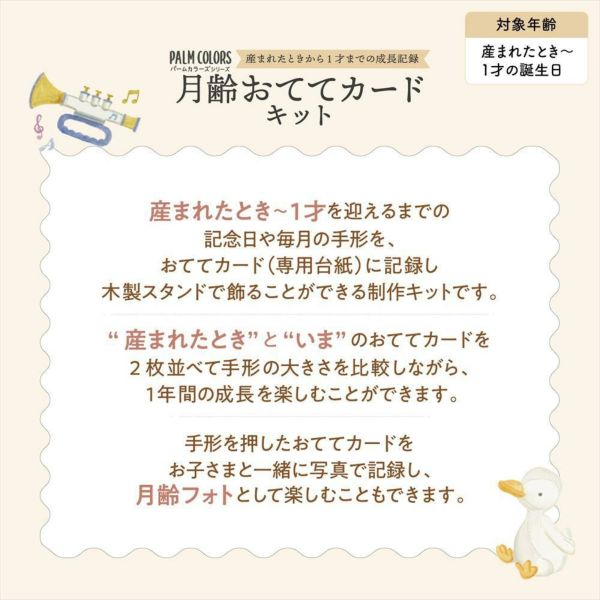 ●産まれたとき~1才を迎えるまでの記念日や毎月の手形を、おててカード(専用台紙)に記録し、木製スタンドで飾ることができる制作キットです。