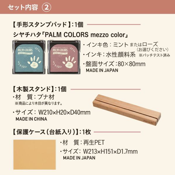 ●[セット内容]専用台紙(台紙サイズ:148×100mm(はがきサイズ)) 15枚、PALM COLORS mezzo color 1個(インキ色は品種により異なります)、木製スタンド 1個、保護ケース(台紙入り) 1枚