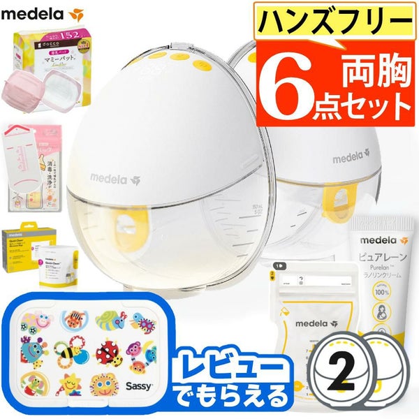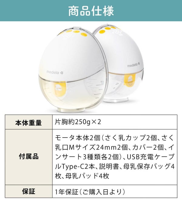 | 付属品 | モータ本体 2個(さく乳カップ 2個、メンブレン 2個、さく乳口Mサイズ24mm 2個、カバー 2個、インサート3種類各2個)、USB充電ケーブル Type-C 2本、使用説明書、母乳保存バッグ4枚、母乳パッド4枚 |