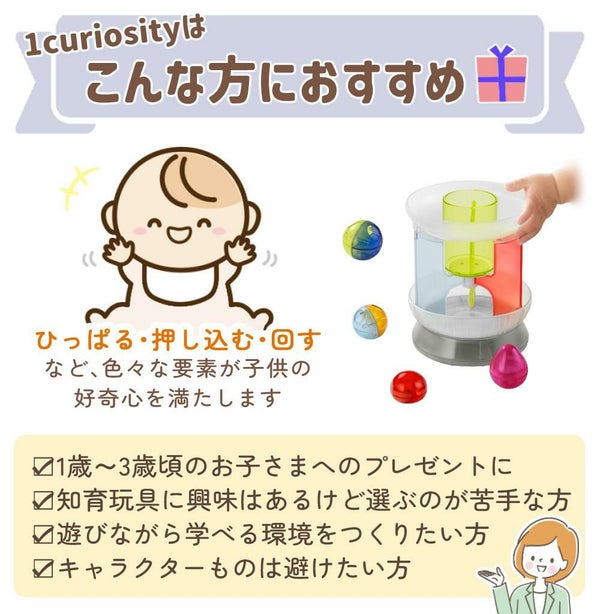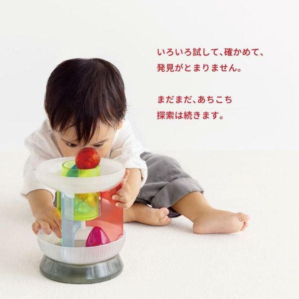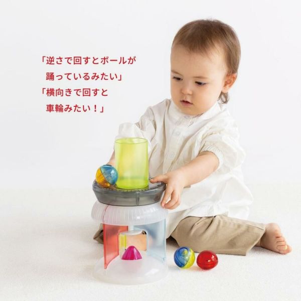 カラ・クルは、カラフルなボールをくるくる回しながら、指先を使った回し方、回転を利用した遊びをサポート。1歳のお子さんが自分の動きとモノの反応を試行錯誤できるように寄り添ってつくられています。