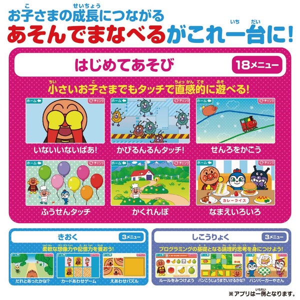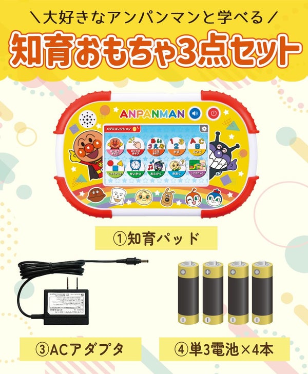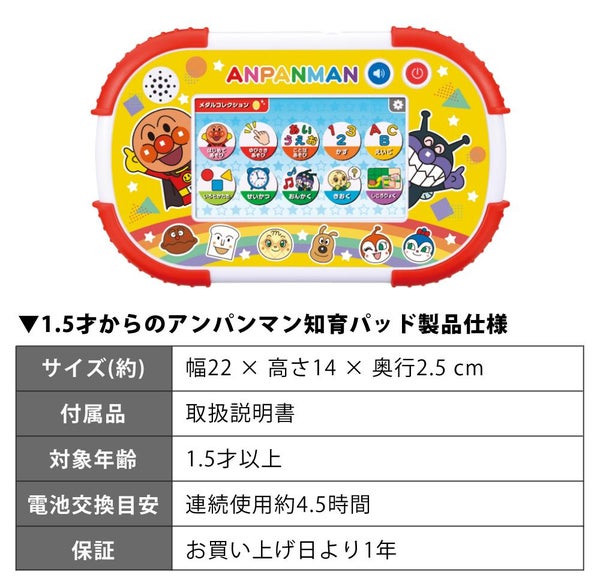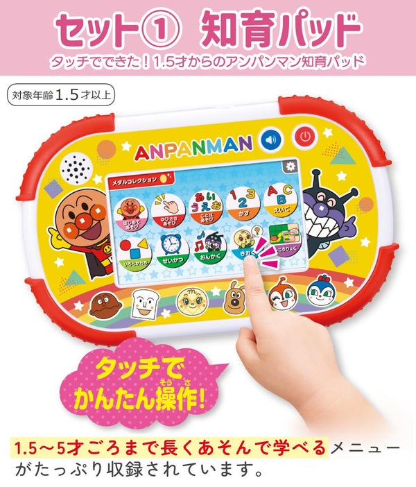 BANDAIのアンパンマン知育パッドは、1.5才からタッチで遊べる知育パッドです。アンパンマンといっしょに、ことばあそび、えいご、かず、いろとかたち、おんがく、ゆびさきあそびなど8カテゴリのメニューを楽しめます。