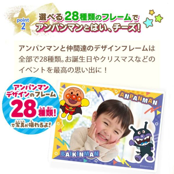 アンパンマンやなかまたちが登場するフレームは28種類!自分だけのかわいい記念写真が撮れます。