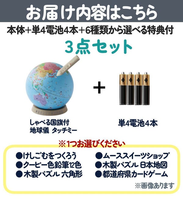 【付属品】タッチペン、しゃべる国旗カルタ(100枚)、カルタケース、地球儀スケール、取扱説明書(1年間保証書) |