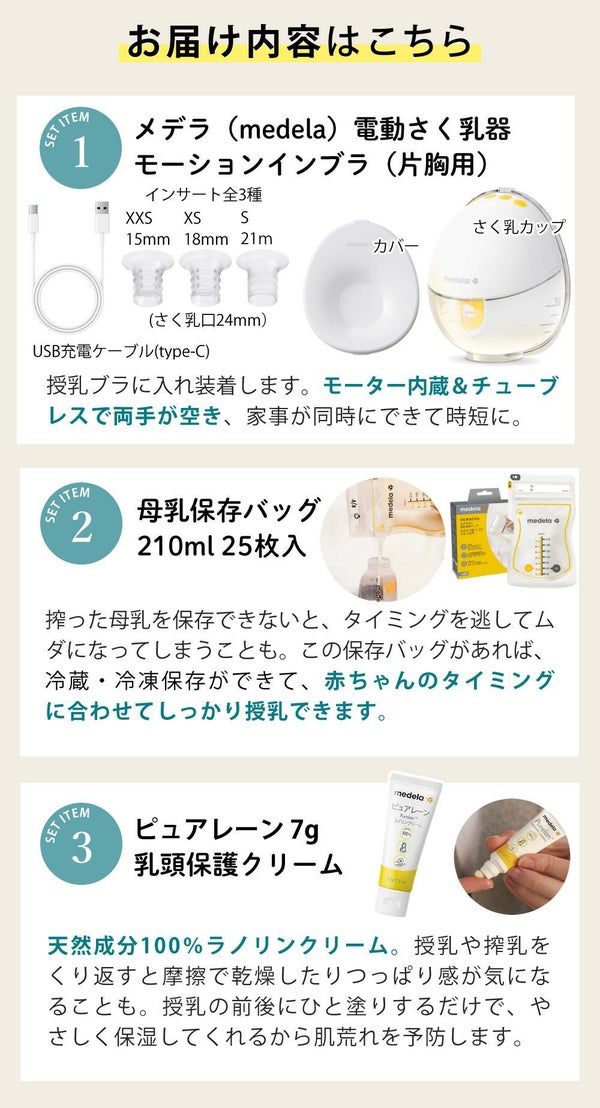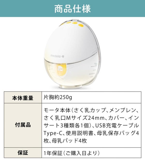 | 付属品 | モータ本体(さく乳カップ、メンブレン、さく乳口Mサイズ24mm、カバー、インサート3種類各1個)、USB充電ケーブル Type-C、使用説明書、母乳保存バッグ4枚、母乳パッド4枚 |