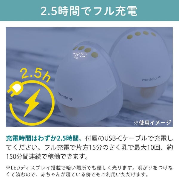 充電バッテリー内蔵。コンセントの前だけでなく、好きな場所に持ち運んでさく乳できます。USB Type-Cケーブル付属。約2.5時間でフル充電でき、片方1回15分のさく乳なら最大10回(約150分)使用できます。