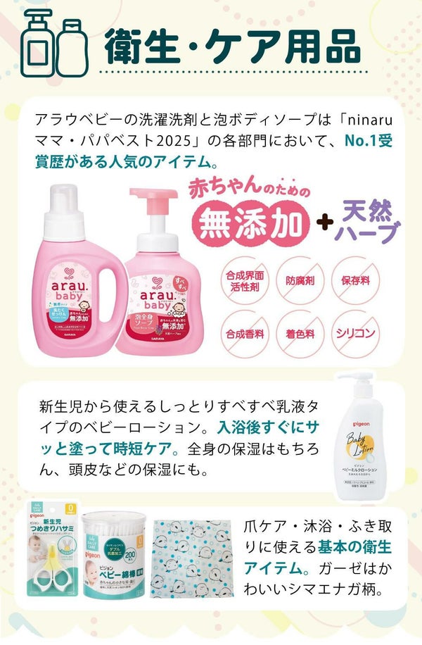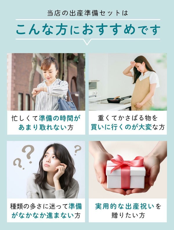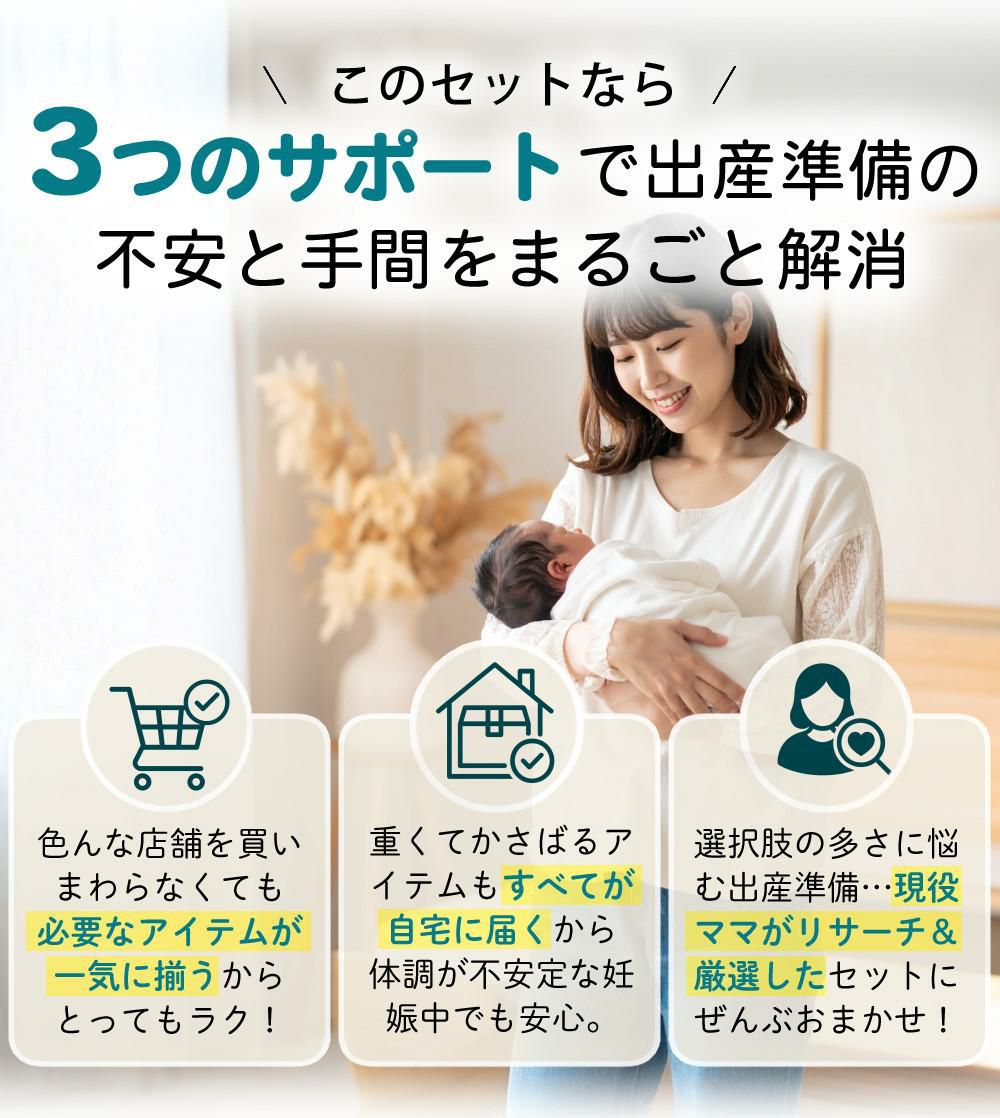 「何をそろえたらいいかわからない」「買い回りが大変」「妊娠中の買い物がしんどい」──そんな方にも安心のお届け内容で、必要なものをまるっとひとまとめにしています。