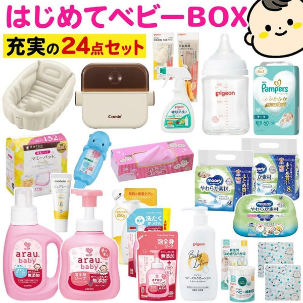 妊娠中 の 出産準備 に迷う方へ。はじめて ベビー BOX 23 点 セット は、パンパースの オムツ、ムーニーの おしりふき、ピジョン(Pigeon) の 授乳グッズ・哺乳瓶、和光堂 の ベビーローション、アラウベビーの 泡ソープ、コンビ(Combi) の 除菌ケース に加え、乳頭ケアクリームや 母乳パッド、ベビーバス、タニタ(Tanita) の 湯温計 など 赤ちゃん の 必需品 +α を網羅。バスグッズから、お母さんのおっぱいケアまでしっかりサポート!安心 して まとめ買い できる ベビーギフト・出産祝い に最適な セットです。