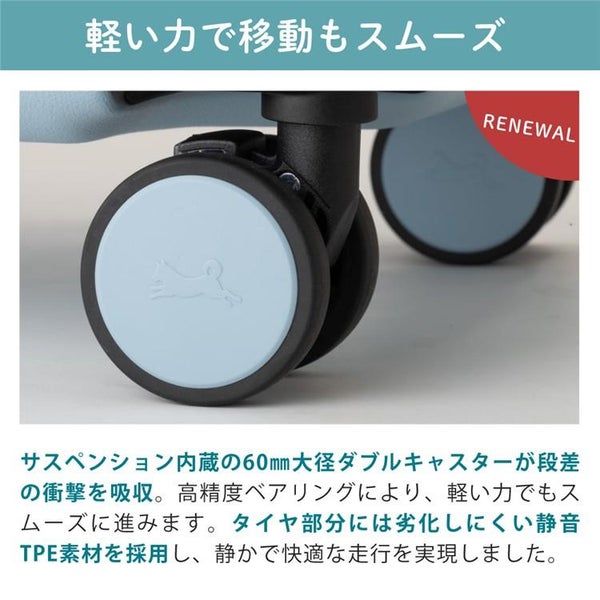 サスペンション内蔵のダブルキャスターが段差の衝撃を吸収。高精度ベアリングにより、軽い力でもスムーズに進みます。タイヤ部分には劣化しにくい静音TPE素材を採用し、静かで快適な走行を実現しました。