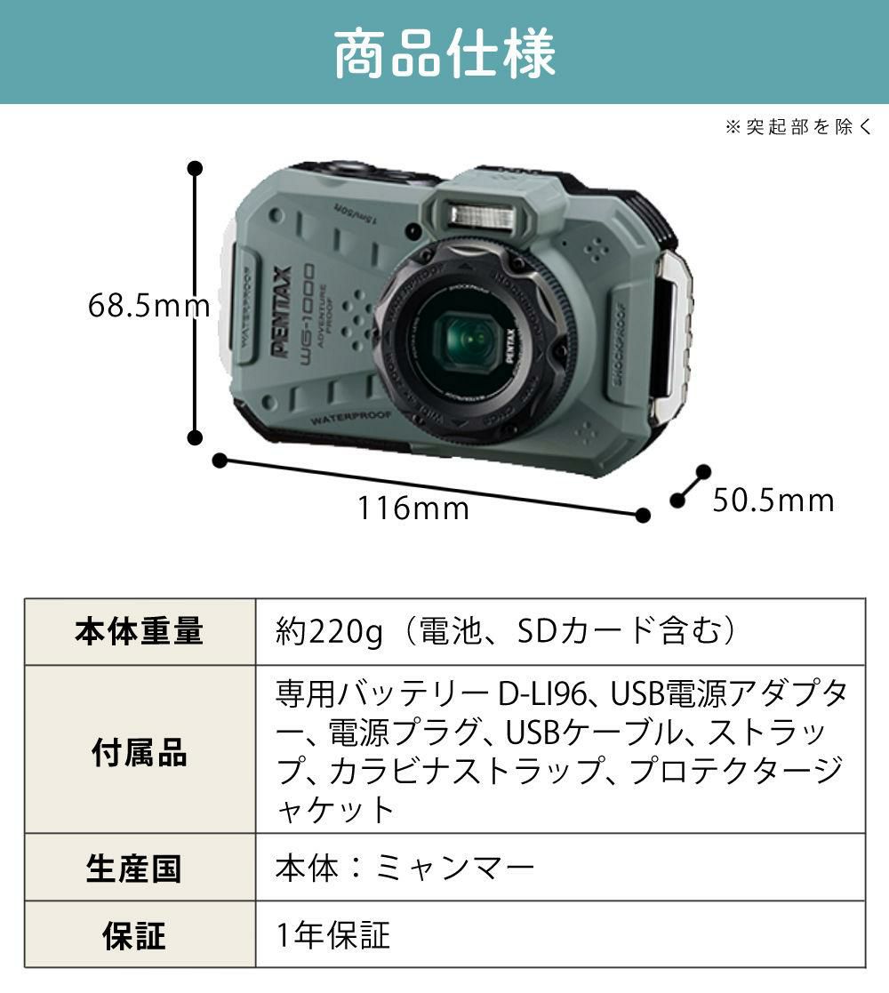 他の画像を見る 本格防水アウトドアカメラ ペンタックス デジタルカメラ WG-1000 グレー SDカード&クロス付き セット 販売価格 ¥ 35,980 税込 カートに入れる お気に入りに登録する (0件)