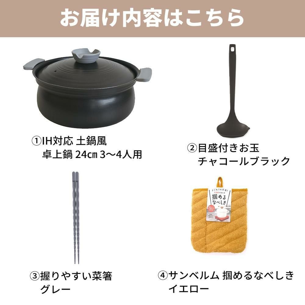 他の画像を見る 届いてすぐ使える おしゃれ鍋 鍋パーティー 蒸し料理 煮込み料理 食卓映え コンパクト 耐熱陶器 直火対応 おしゃれ キッチン雑貨 ギフト 土鍋風 卓上鍋 IH ガス火 24cm K-10661BK 3-4人用&ナイロンお玉&握りやすい菜箸&掴めるなべしき 4点セット 週末2%OFFクーポン 販売価格 ¥ 3,900 税込 カートに入れる お気に入りに登録する (0件)