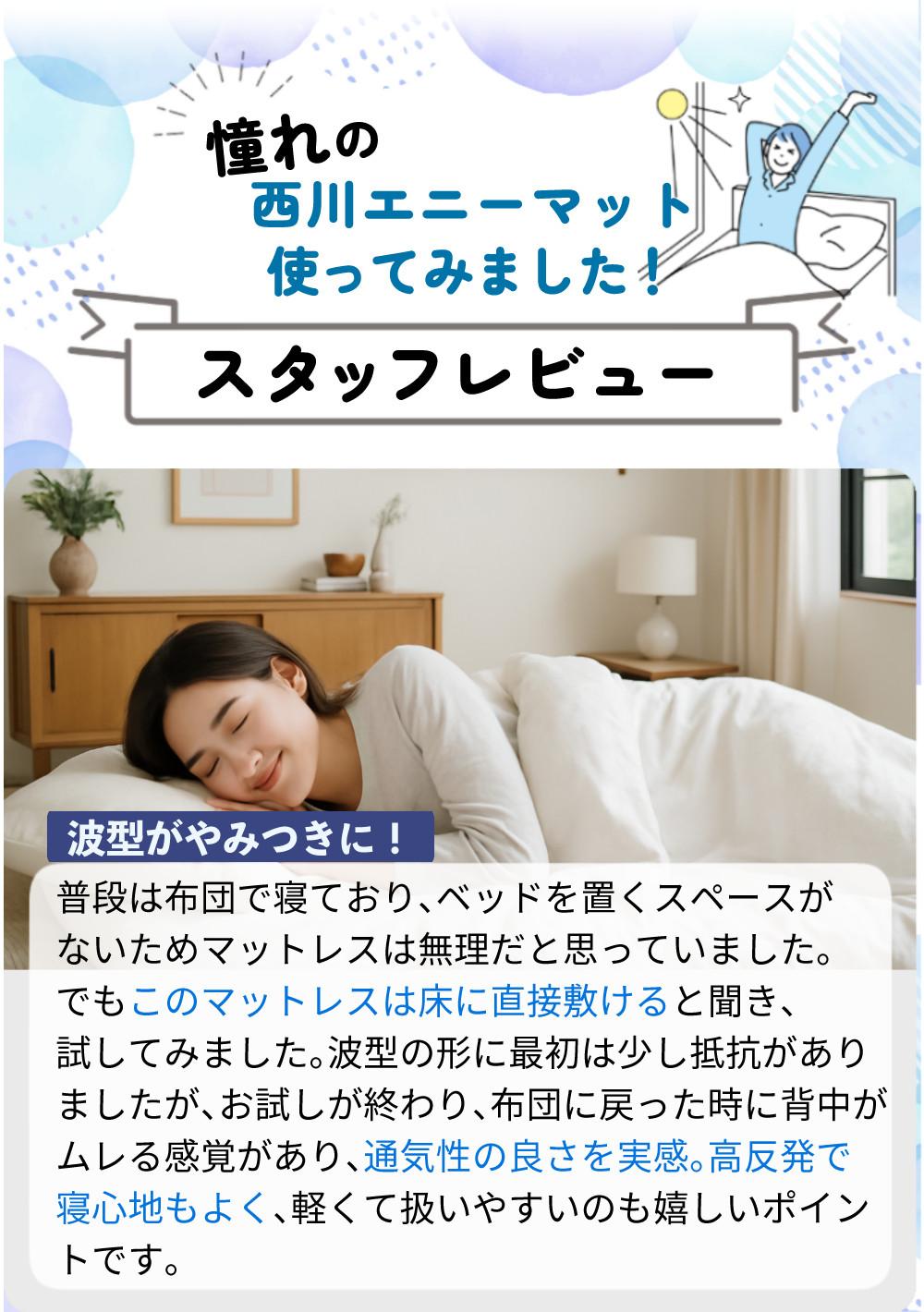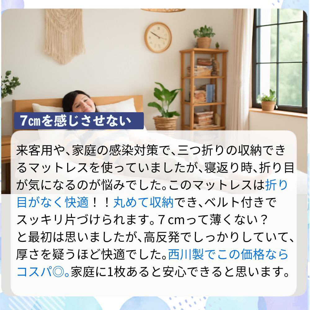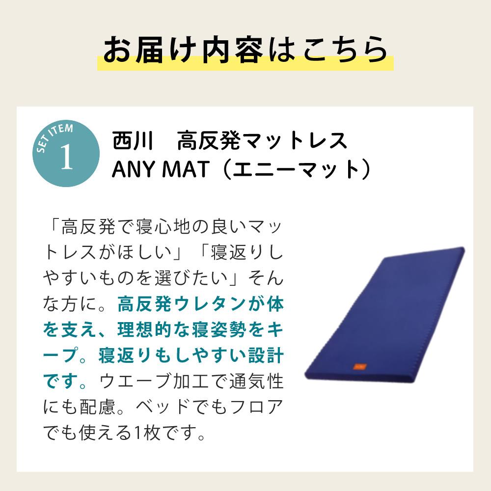 他の画像を見る 高反発ウレタンで体をしっかり支え、寝返りラクラク。快適な寝心地をお届けする「ANY MAT(エニーマット)」 (シーツセット)西川 マットレス エニーマット 丸巻き ブルー S 高反発 通気性 軽量 シングル 97X195X7cm レビュー特典あり(ラッピング不可) 販売価格 ¥ 11,800 税込 カートに入れる お気に入りに登録する (0件)