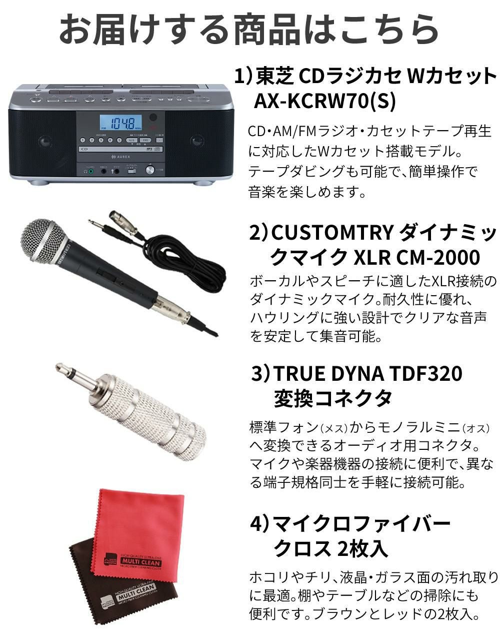 他の画像を見る ラジカセ 録音機能 音楽再生 カセットレコーダー cd再生 ステレオスピーカー AUX入力 【2026年3月19日発売】東芝 CDラジカセ AX-KCRW70(S) シルバー マイク CM-2000 コネクタ TDF32 クロス付 4点セット カラオケ 録音(ラッピング不可) 販売価格 ¥ 27,500 税込 カートに入れる お気に入りに登録する (0件)