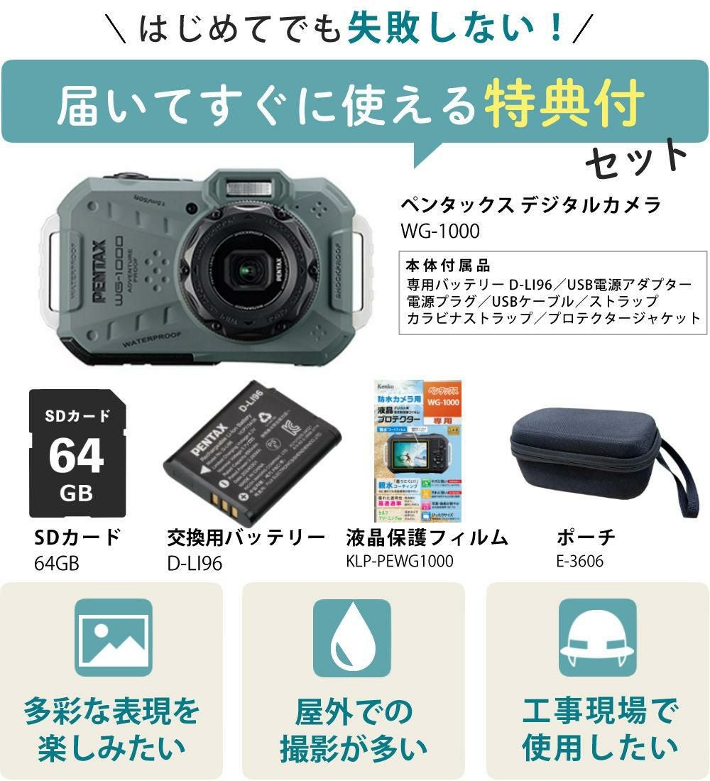 他の画像を見る ( 本格防水アウトドアカメラ ) PENTAX WG-1000 オリーブ 予備バッテリー&液晶フィルム&SDカード&カメラケース付き 5点セット(レビュー特典あり) 販売価格 ¥ 41,500 税込 カートに入れる お気に入りに登録する (0件)