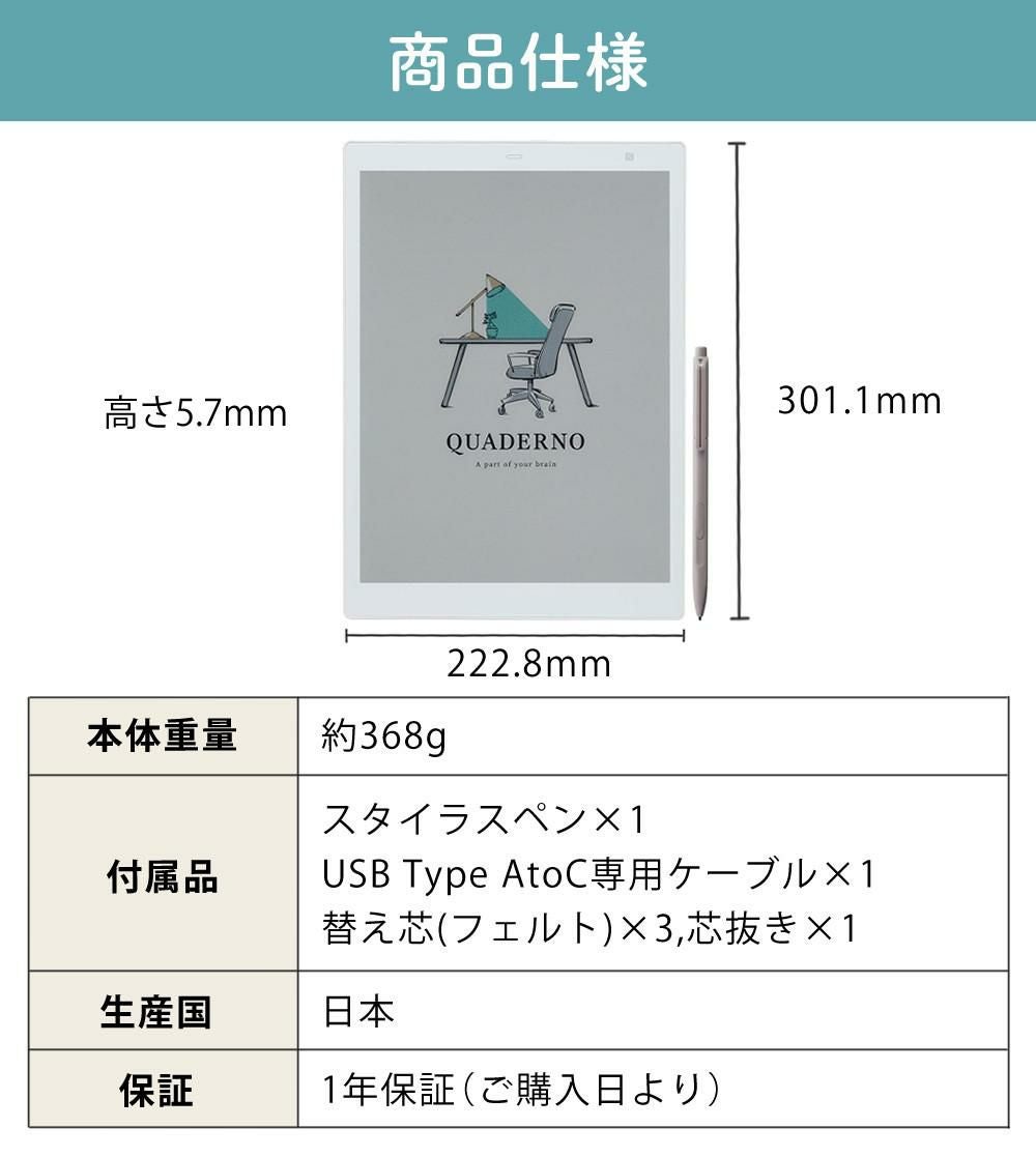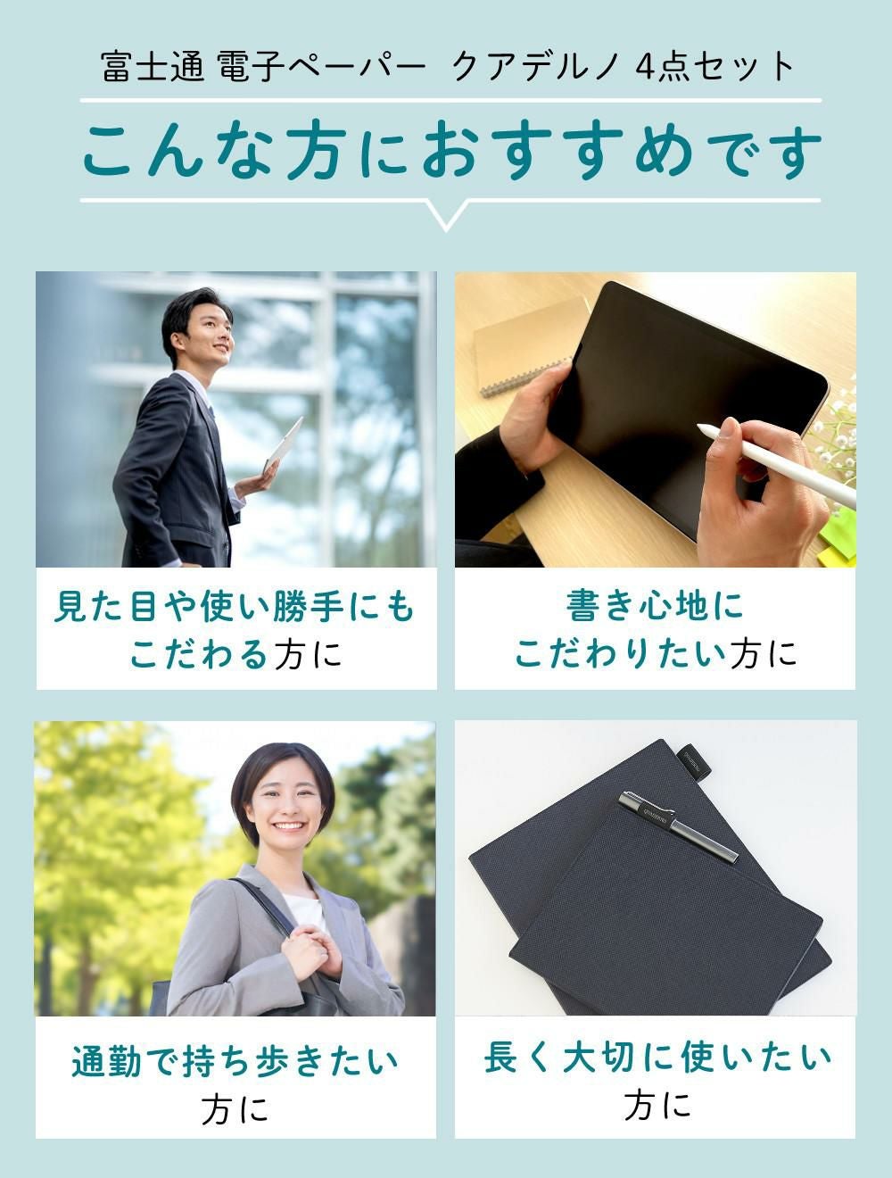他の画像を見る 「紙のような書き心地。カラー表示でさらに進化した『クアデルノ』電子ペーパー!」 富士通 電子ペーパー クアデルノ QUADERNO A4 (Gen.3C)FMVDP43CA4 カバー FMVCV41BK ペン FMVDGPASP4 クロス付き 軽量 薄型(ラッピング不可) 週末2%OFFクーポン 販売価格 ¥ 93,800 税込 カートに入れる お気に入りに登録する (0件)