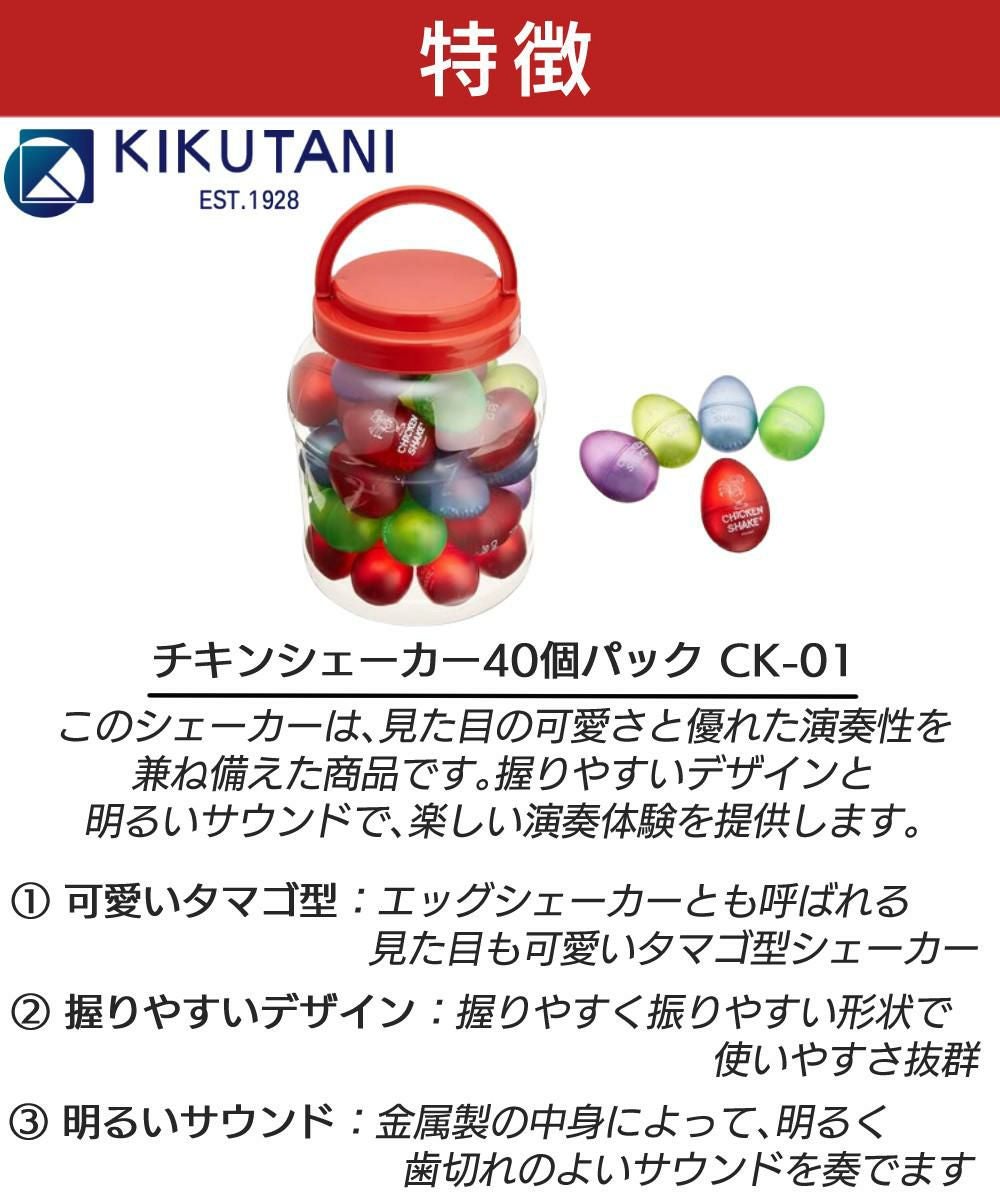 他の画像を見る CK-01タマゴシェーカーは、見た目の可愛さと優れた演奏性を兼ね備えた商品です。 たまご マラカス おもちゃ キクタニ チキンシェーカー CK-01 40個パック エッグシェイカー 週末2%OFFクーポン 販売価格 ¥ 7,680 税込 カートに入れる お気に入りに登録する (0件)