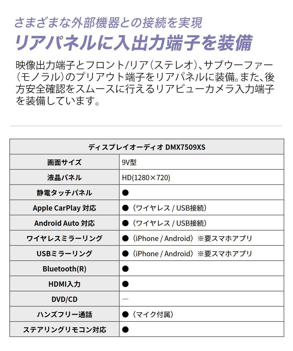 他の画像を見る ワイヤレス Apple CarPlay / Android Auto(TM)/ワイヤレスミラーリング対応 ディスプレイオーディオ (カークロス付き)ケンウッド カーオーディオ ディスプレイオーディオ DMX7509XS 9インチ carplay Android Auto 対応(ラッピング不可) 週末2%OFFクーポン 販売価格 ¥ 77,850 税込 カートに入れる お気に入りに登録する (0件)
